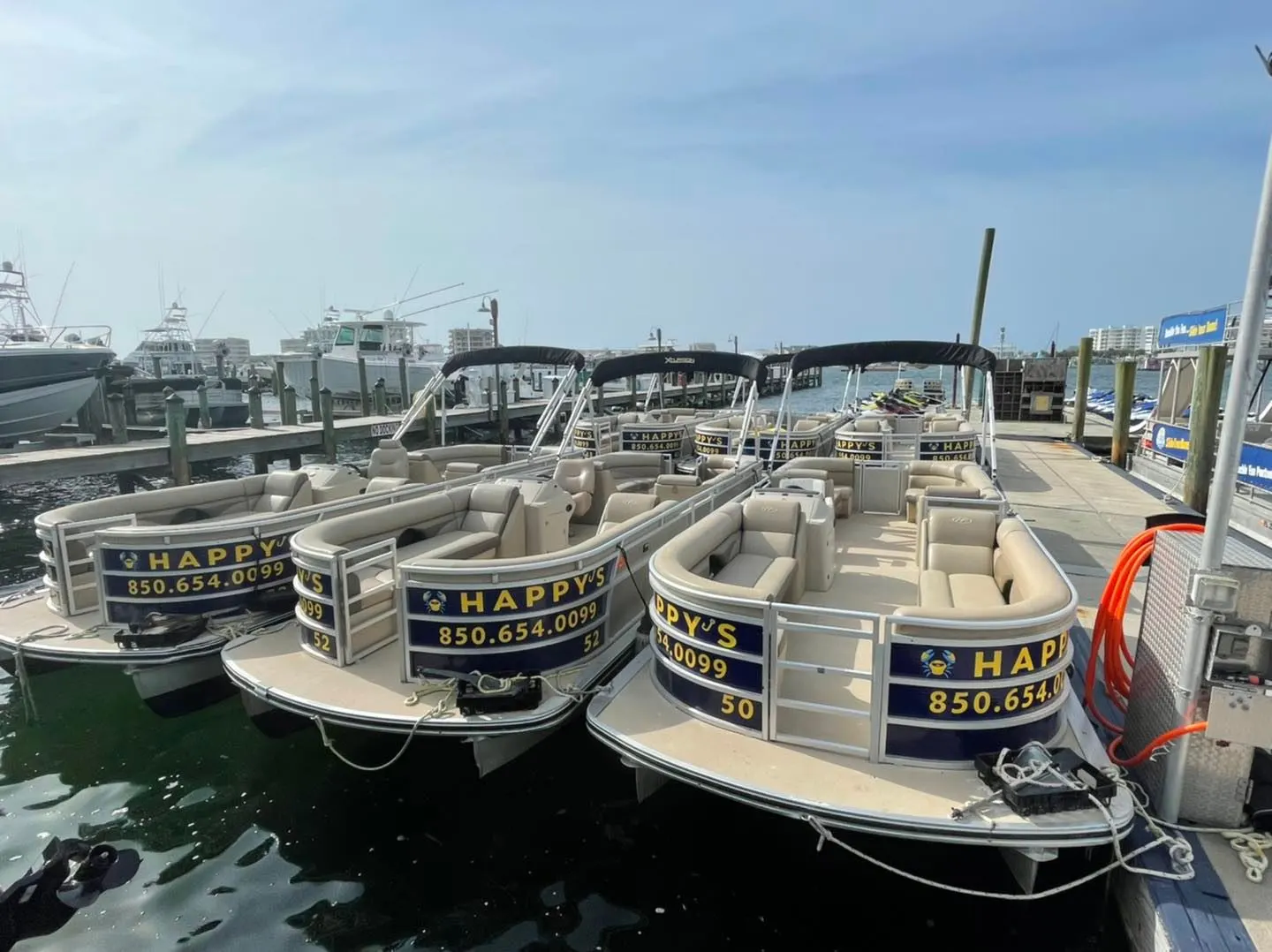 Maybe you want to be the captain as you take the whole family out for a day of fun on Happy’s Watersports’ 2025 Trifecta Pontoon Boats. When leaving our facility, you are conveniently located to all the hot spots Destin has to offer. Across from us, you can enjoy the snow white sand on the beaches of Noreigo Point. Take a cruise through the harbor and do some sightseeing or mosey into the Choctawhatchee Bay to Crab Island. Pontoon boats are a great way for small or large groups up to 13 people to enjoy the pristine beaches of Destin. Imagine yourself anchored out in the Destins emerald green waters enjoying water sports, sunbathing, picnicking, swimming, snorkeling, or just sitting back relaxing as you cruise the areas island chain taking in all the breathtaking views. Our pontoon boats are equipped with four stroke motors, which are unbelievably quiet. Each boat is equipped with a bimini top which covers and protects ½ the boat from the sun. Also, life jackets are available for each person onboard and a ladder for getting in and out of the water. Happy’s Watersports allows the pontoon boats to go anywhere except for the Gulf of Mexico. Fuel is included in the price of the pontoon boat.